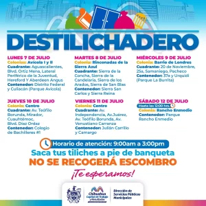 Chihuahua, Chih.— El Gobierno Municipal, a través de la Dirección de Servicios Públicos, anunció que el programa Destilichadero estará activo del 7 al 12 de julio en diversas colonias de la ciudad, con el objetivo de apoyar a las familias en el desecho de objetos voluminosos que no recoge el camión regular de basura.